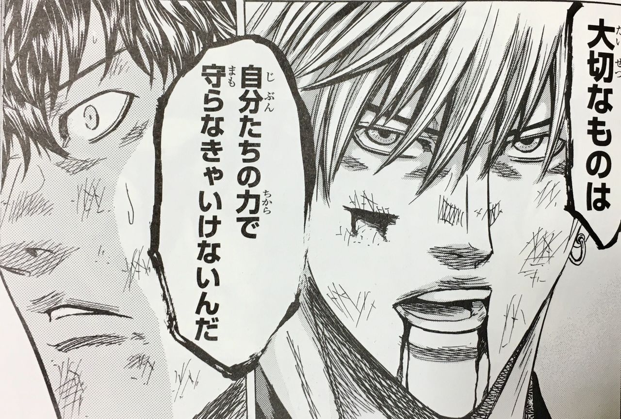 細川先生の『シュガーレス』という作品を表するのに、ファンの間ではしばしば「ヤンキーポエム」というような言葉が使われていました。不良たちが喧嘩しまくる世界観に細川先生独特のポエム…台詞回しが絡み合う作風をよく現した言葉です。『ハイロー』は原作のある作品なので、登場する台詞ももちろんおおよそ原作通りです。しかし『シュガーレス』における「ヤンキーポエム」が単にその内容だけでなくそれが発せられる状況であったり、キャラクターの強い表情であったり…そういった要素によってより映えるものであったのと同じで、この『ハイロー』コミカライズにおいてもキャラクターから発せられる台詞がより印象的に映るような作画がされている点も「細川版」の魅力だと思います。